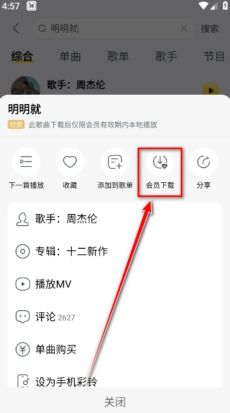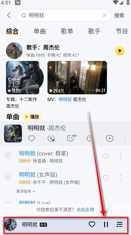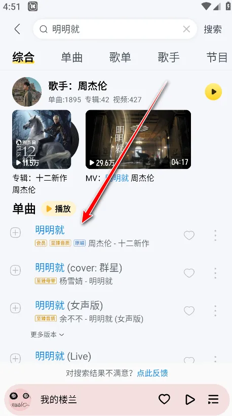 1.打开酷我音乐,点击搜索框输入歌曲关键字,在这里小编以明明就为例,接着点击搜索,然后点击我们想要的歌曲版本后面的三个点。