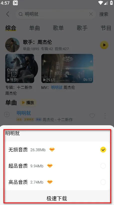 3.选择并点击我们想要的音质,然后点击极速下载,耐心等待下载完成即可。
