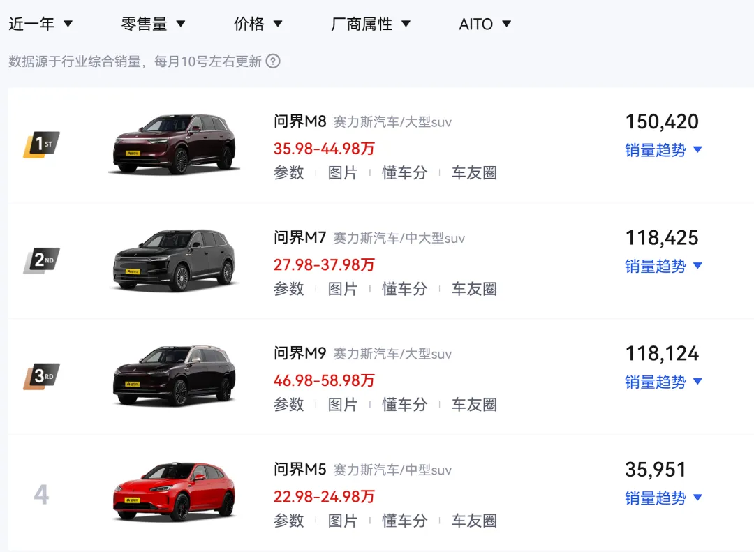从销量上来看,问界M8是成功的,在问界M9成功的前提下,问界M8作为“低配版问界M9”自然是更容易成功,只是问界M9的销量越来越低,上个月的销量已经不足10000辆。
