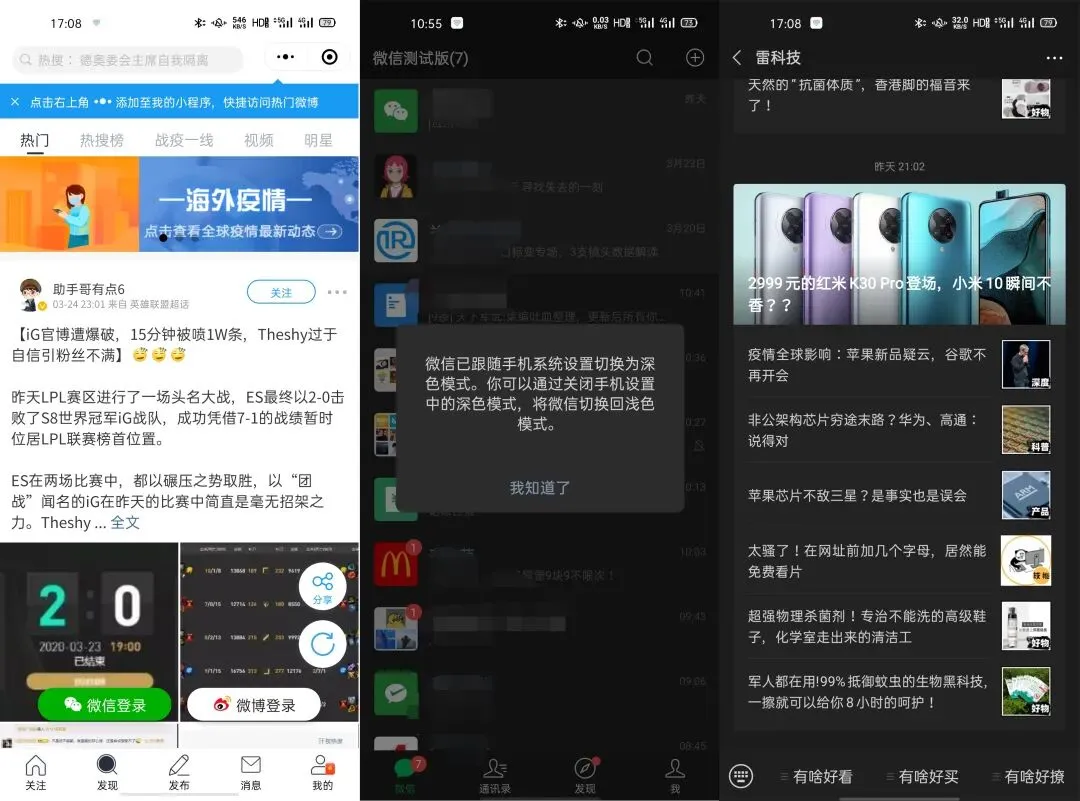 上周末,iOS版微信突然更新,新版本最大的惊喜恐怕就是支持深色模式。然而早在2019年12月中旬,当时的安卓用户就已经体验过了微信的深色模式,尽管当时深色模式只出现在测试版软件上。
