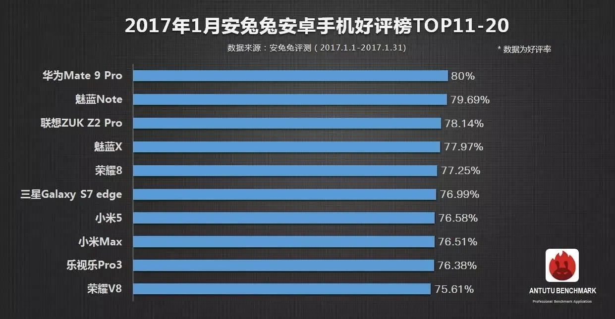 据悉,该榜单来自2017年1月份安兔兔后台的安卓手机评论数据(1月1日-1月31日),评选的标准为好评率,好评率的计算公式为:好评率=该机的五星好评数量/该机的所有评论数量。