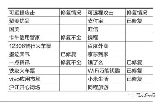 “截至2018年1月9日,27款存在漏洞的App中有11个已进行修复,但其中有三个没有完全修复”,于旸称。此外,“目前还没有收到反馈的App厂商包括京东到家、饿了么、聚美优品、豆瓣、易车、铁友火车票、虎扑、微店等10家厂商”,李佳向南都记者表示,对于拒不修复的将会按照《网络安全法》采取强制措施。