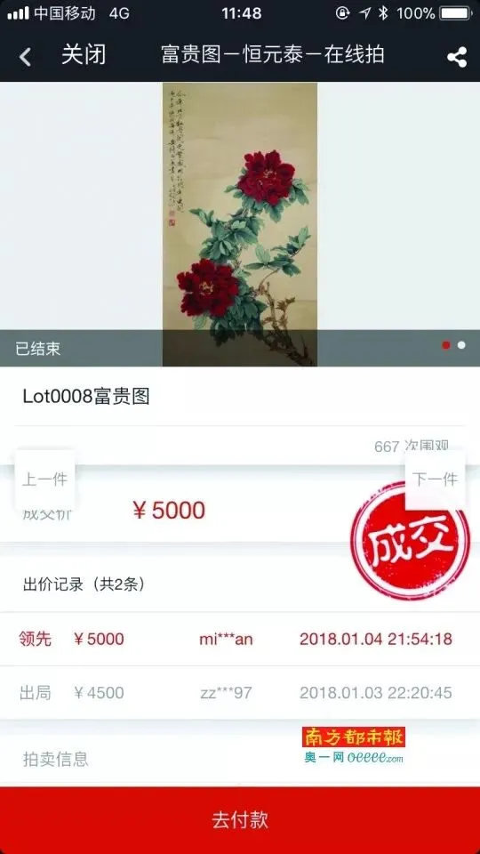 于非闇是中国近现代的工笔画大师。日前,有深圳市民在艺术品交易平台上用5000元拍下了于非闇的一幅牡丹图,临付款前才得知平台上的这幅画作并非真品,便向平台提出投诉。涉事平台回复称,经过与拍卖公司沟通,已同意退还事主的交易保证金。(南方都市报)