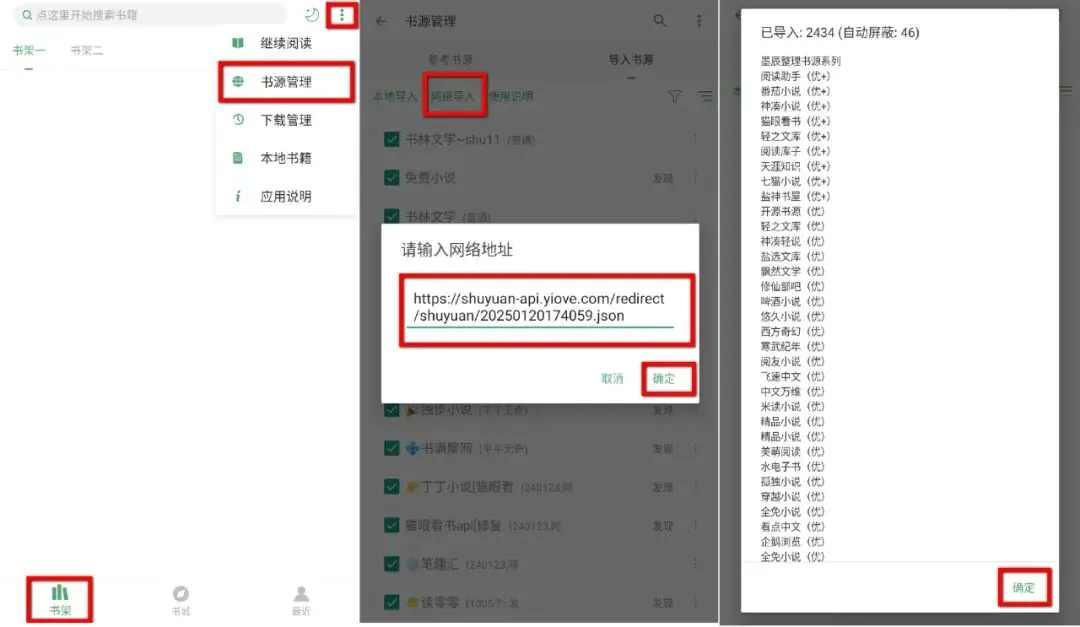 【书架】→右上角三个点→【书源管理】→【网络导入】→输入书源地址→【确定】→【确定】→导入成功
