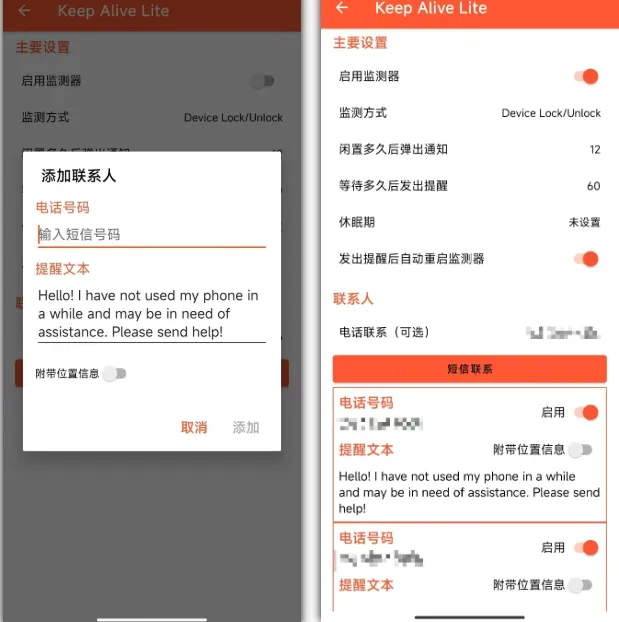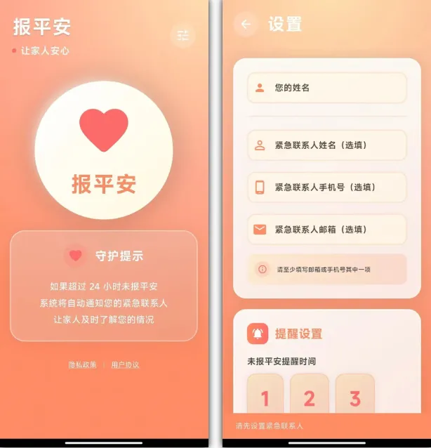 这是一款开源免费的 APP,使用时无需日常签到。但如果在预设时间内未打开软件,它会自动向紧急联系人发送短信、拨打电话。