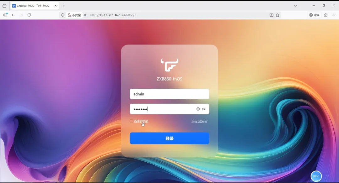 2.然后我们刷新页面,进入到登录页面,用我们刚设置的超级管理员账户和密码登录飞牛OS后台。