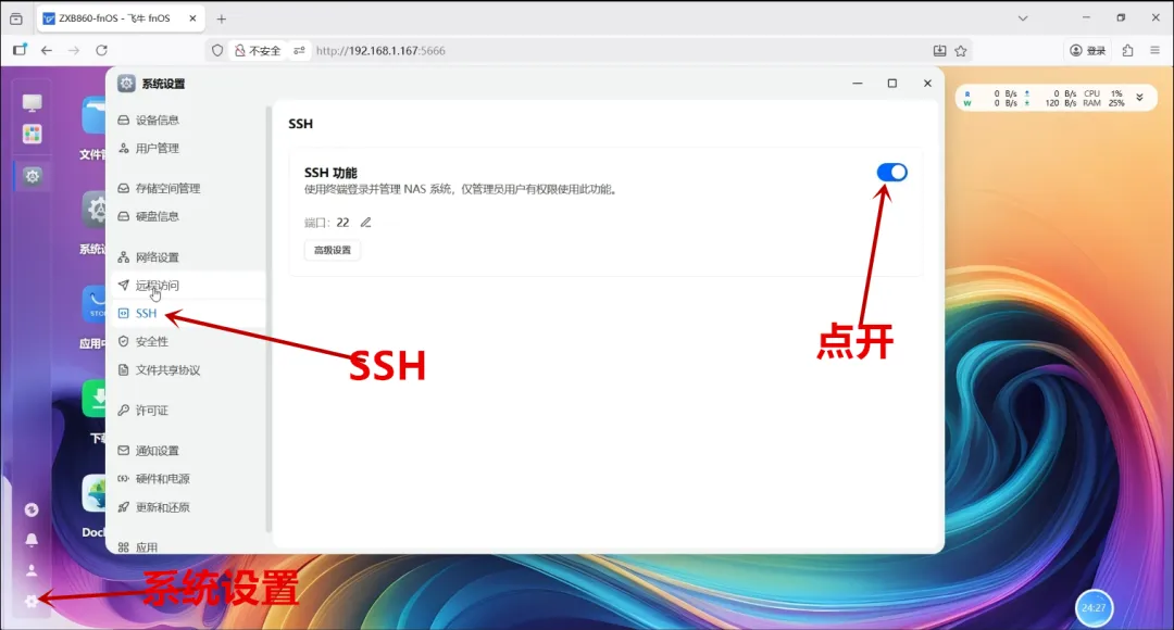 点左下角设置,左侧栏里SSH,然后我们开启。