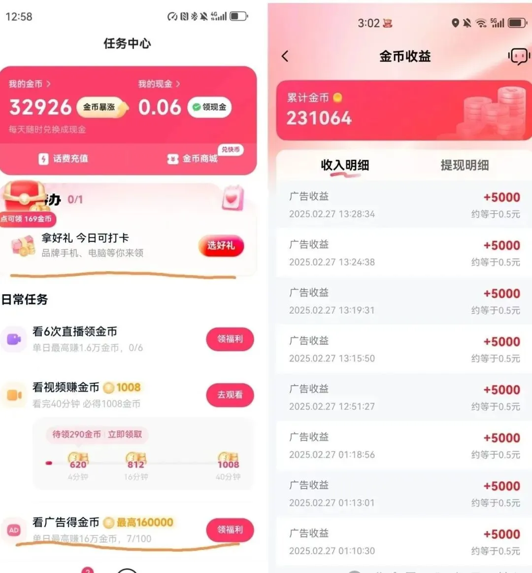 大家好!我是阿水,超爱琢磨那些热门的网络项目。平时我都会把项目拆解分析,希望能帮大家少踩坑。觉得有帮助的话,别忘了关注我哦!那句老话“三百六十行,行行出状元”说得太对了。现在是互联网时代,想稳稳当当挣点小钱,其实挺容易的,很多正规免费的小软件都能帮到你。今天,阿水就来给大家分享5个正规赚钱小软件,每天轻轻松松挣50元,赚钱速度比打工还快,特别适合副业党。一、快手极速版:刷视频也能赚钱