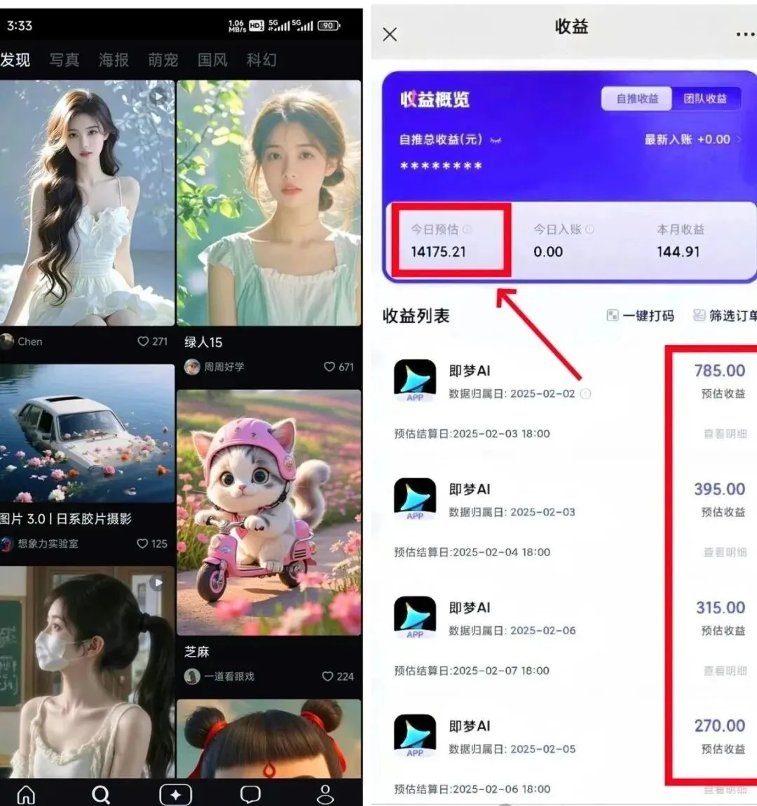 刷视频、看广告、赚零花钱,这事儿一直很受欢迎,快手极速版就是这里面的高手。上班时,把手机音量调小,插上充电器搁在支架上,偶尔点点快手的广告、领领宝箱金币,就能有收入啦。我也是看到别人在玩,就跟着试了试,结果每天也能稳稳地赚个几块钱。别小看这些零零碎碎的钱,日积月累下来,也是一笔可观的收入。就像那句老话说的,“小钱看不上,大钱也赚不到”,很多人就是靠这种方法批量操作,一天轻轻松松就能有几百块的收益。这就是著名的28定律,懂的人都知道。二、即梦AI:AI绘图的赚钱利器
