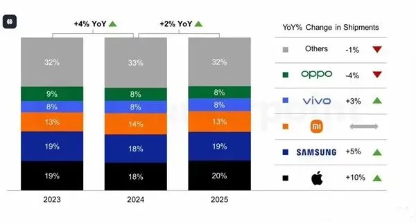 2025全球手机排行榜出炉2025全球手机排行榜出炉,苹果连续两年超越三星夺得销冠,传音跌落排名,OPPO进入排名。① 苹果,份额20%,增长10%② 三星,份额19%,增长5%③ 小米,份额13%,保持不变④ vivo,份额8%,增长3%⑤ OPPO,份额8%,下滑4%2025中国手机出货量排行榜出炉2025中国手机出货量排行榜出炉,合计2.85亿台,华为重返市场第一,荣耀掉出前五。①华为,份额16.4%,下滑1.9%②苹果,份额16.2%,增长4.0%③vivo,份额16.2%,下滑6.6%④小米,份额15.4%,增长4.3%⑤OPPO,份额15.2%,增长2.1%小米手机十年间全球出货量看了下小米手机从2016年至2025年十年间全球出货量数据汇总:2016年:5542万台;2017年:9141万台;2018年:1.19亿台;2019年:1.25亿台;2020年:1.46亿台;2021年:1.9亿台;2022年:1.52亿台;2023年:1.46亿台;2024年:1.69亿台;2025年:1.66亿台;