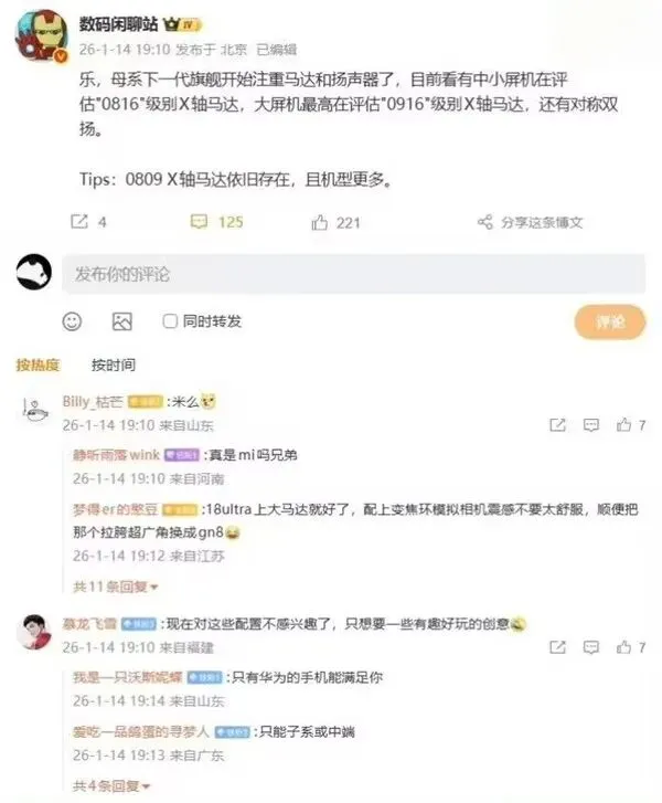 博主 数码闲聊站 发文透露,母系某厂下一代旗舰开始注重马达和扬声器了,目前看有中小屏机在评估 "0816" 级别 X 轴马达,大屏机最高在评估 "0916" 级别 X 轴马达,还有对称双扬。博主表示0809 X轴马达依旧存在,且机型更多。从评论区讨论来看,系列旗舰新机预计归属小米。小米17标准版手机采用 0809C X 轴线性马达和 1014E+1115X 双扬声器;小米 17 Pro采用 0809C X 轴线性马达和 1014E+1115X 双扬声器;小米17 Pro Max采用 0809E X 轴线性马达和 1014E+1115X 双扬声器。有网友询问母系中杯大杯会考虑上 2K 吗?博主表示:“中杯没可能,有厂商迭代大屏版在测 2K。”