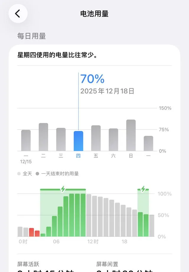续航方面,iPhone 13内置3240mAh电池,支持20W有线快充和15W MagSafe无线充电。升级iOS 26.2后,实测一天重度使用(刷视频、拍照、导航、轻度游戏)剩余电量依然能稳稳撑住51%,和iPhone 15标准版的表现几乎一致。要知道,新iPhone虽然芯片制程更先进,但电池容量并没有明显提升,实际续航反而和降价后的老旗舰打成平手。尤其是夜间待机功耗极低,8小时仅掉电2%,彻底告别“早上起床一看没电”的尴尬。