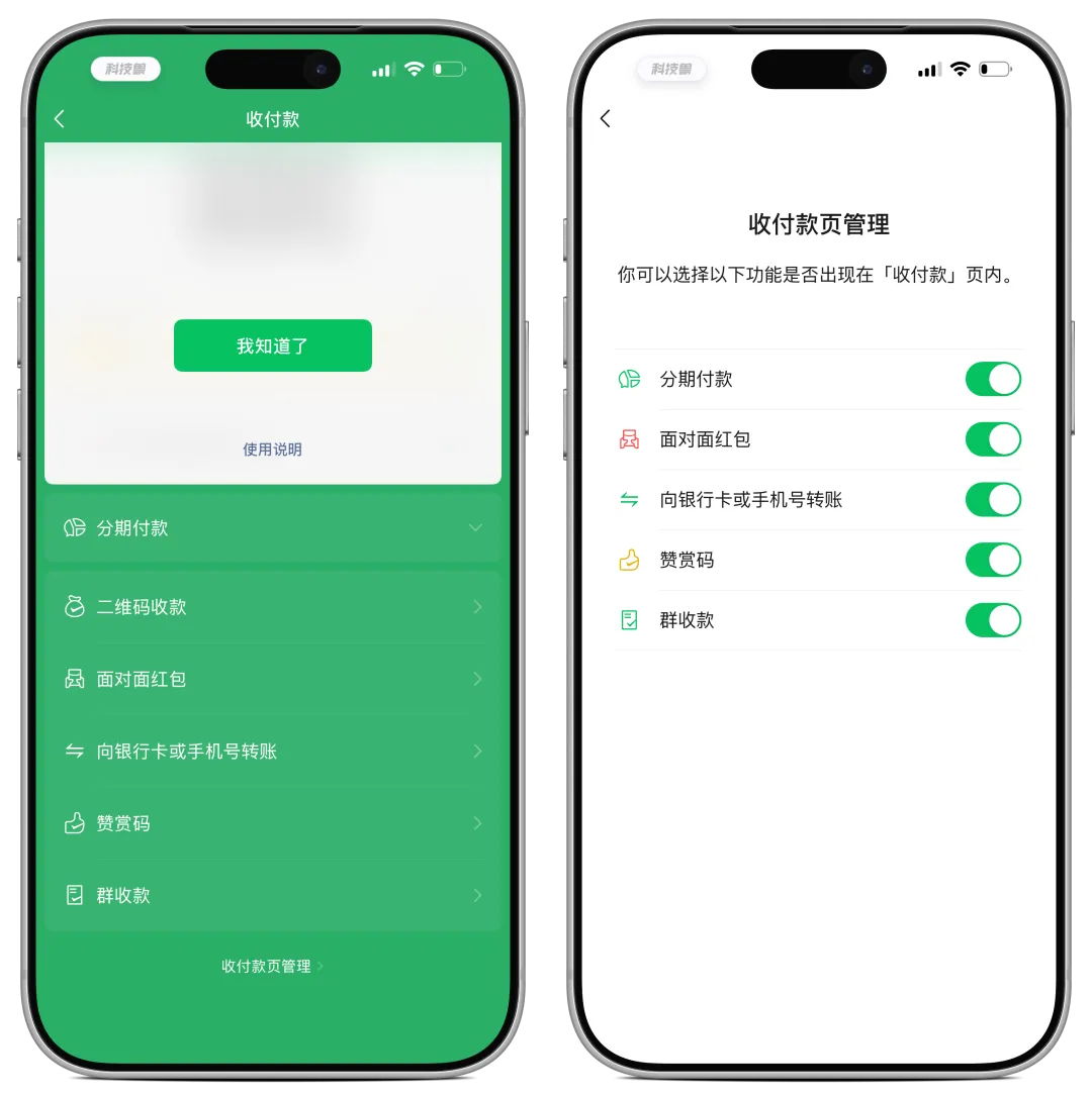 在 iOS 微信 8.0.68 版本中,收付款界面新增了「收付款页管理」入口,点击后可以自定义哪些功能按钮显示或隐藏。