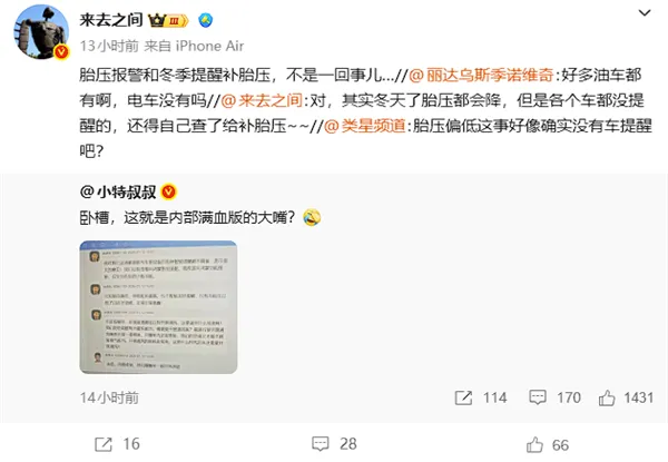 他还给出不该提醒的理由:高速行驶开窗通风噪音大得一塌糊涂,开窗车内还容易脏,我们的空调又不是不具备换气能力。开窗通风的能耗非常高,这是什么时代的车还需要开窗通风?”