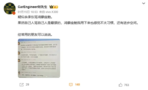 不少博主以及鸿蒙智行的用户表达了对余承东的支持,有人称“果然自己人骂自己人最狠”“老板自己开,才能发现问题;老板敢骂,才能解决问题”“看得出来,大嘴确实每天都在用自家产品,才能关注到如此细微的功能”。