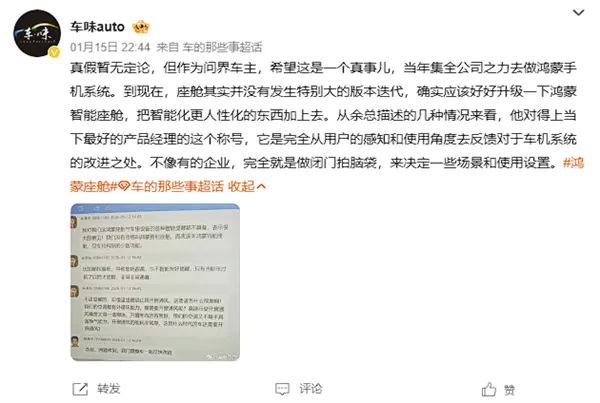 电动学堂1月16日消息,昨晚一张“余承东内部批评鸿蒙座舱”的照片在网络上疯传,多名汽车博主争先恐后分享,甚至吸引了微博CEO来去之间的关注。