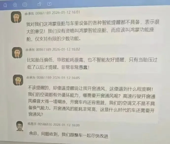 言论发出后,群内相关产品负责人第一时间响应,表态将联合整车团队尽快推进问题整改。