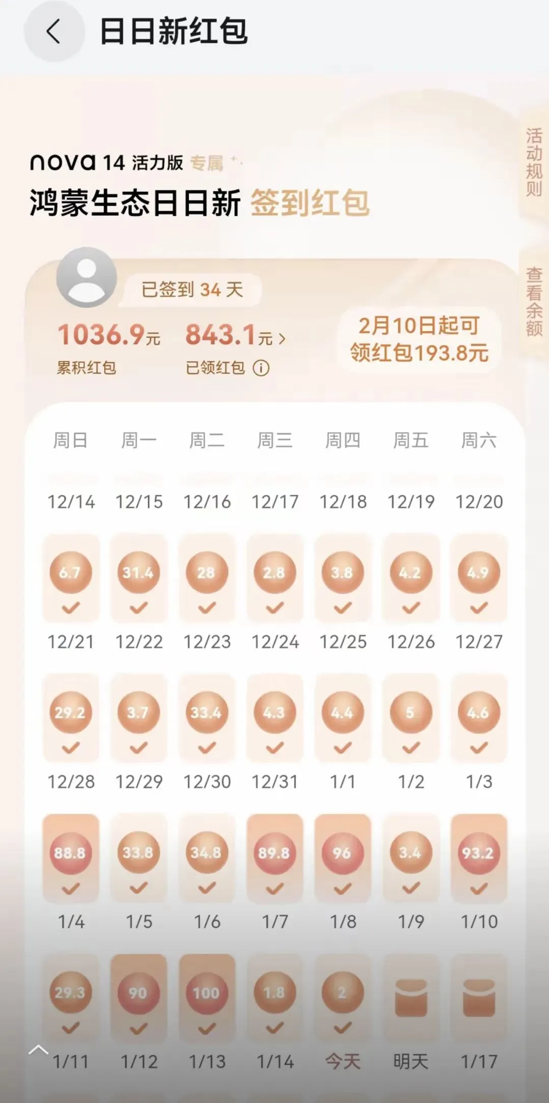 华为手机鸿蒙薅羊毛日日新领红包,34天了领了1036元,刚开始会有一个两个大包,快一个月的时候发现又有大包,超过1000块钱以上基本上没什么大红包了!捡个大便宜,相当于几百块钱买了一个手机,也值了!你的红包多少?分享一下吧!