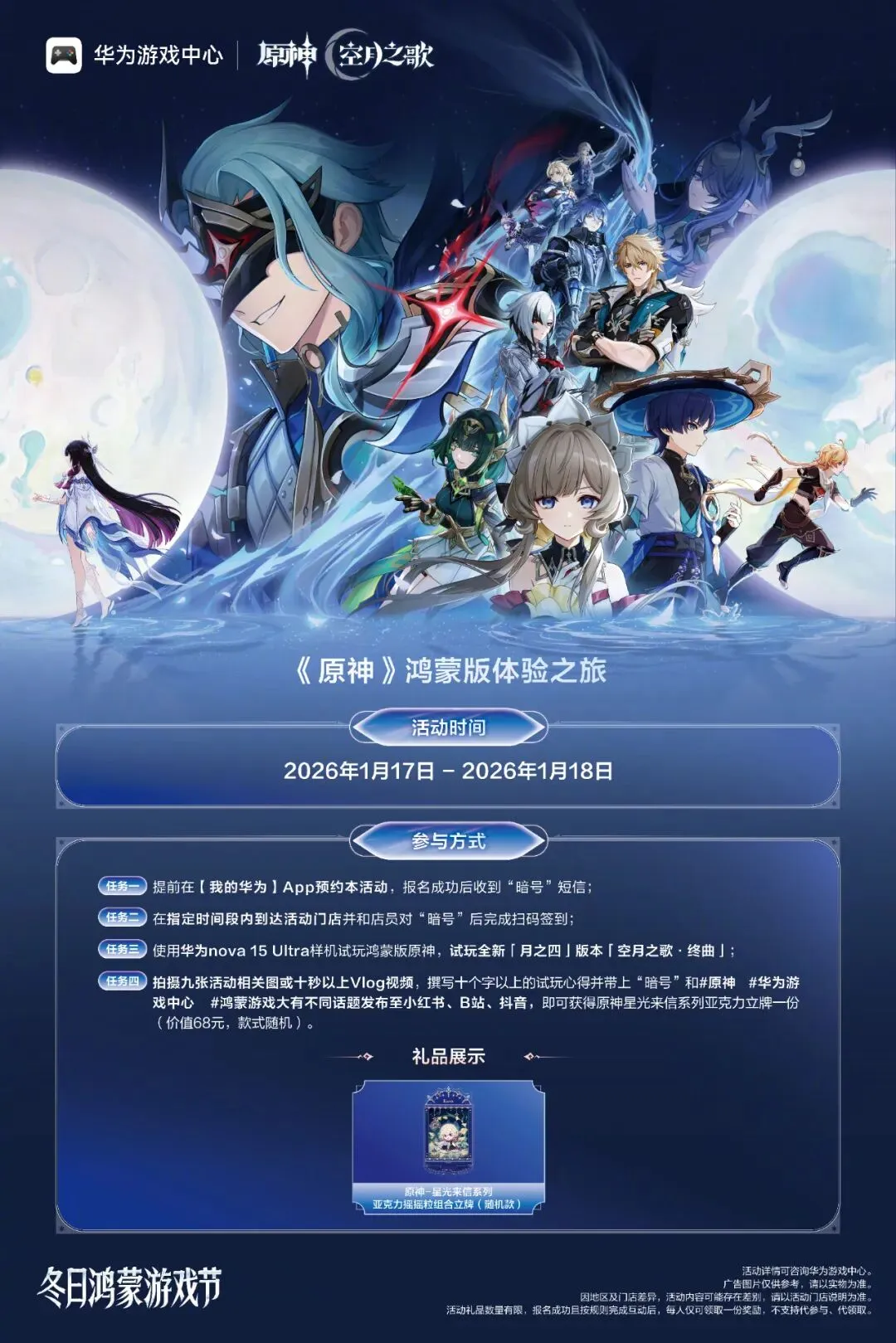 前往【我的华为】App提前预约获取神秘暗号,到店签到试玩并分享心得,即可领走原神星光来信系列亚克力立牌。