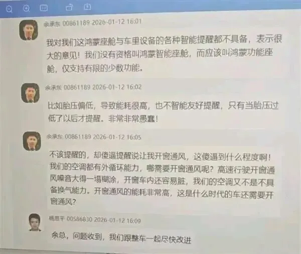 快科技1月16日消息,昨晚一张“余承东内部批评鸿蒙座舱”的照片在网络上疯传,多名汽车博主争先恐后分享,甚至吸引了微博CEO来去之间的关注。从图片内容看,是余承东在内部就鸿蒙座舱进行犀利的批评,他尖锐地指出了自己在使用过程中遇到的痛点问题。余承东首先表达了自己的不满:我对我们这鸿蒙座舱与车里设备的各种智能提醒都不具备,表示很大的意见!我们没有资格叫鸿蒙智能座舱,而应该叫鸿蒙功能座舱。仅支持有限的少数功能。