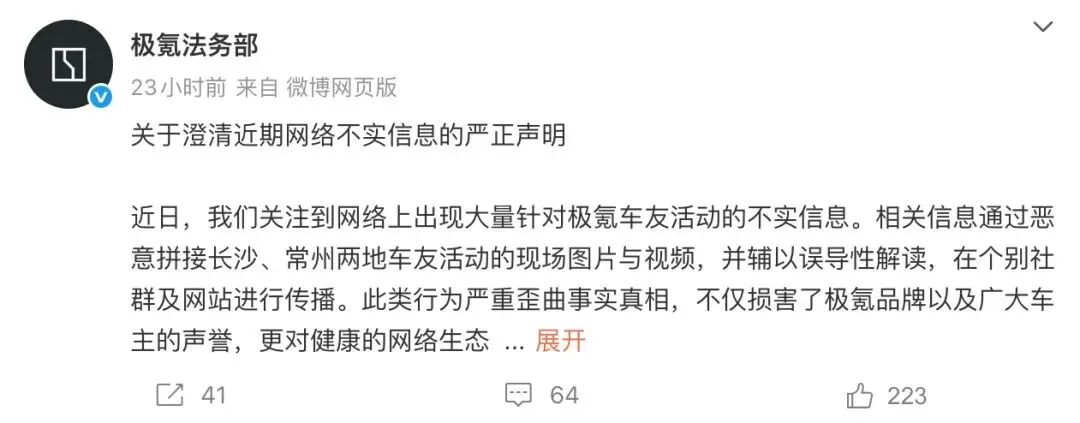 1月14日,极氪法务部发布《关于澄清近期网络不实信息的严正声明》。声明内容显示,极氪汽车关注到网络上出现大量针对极氪车友活动的不实信息。相关信息通过恶意拼接长沙、常州两地车友活动的现场图片与视频,并辅以误导性解读,在个别社群及网站进行传播。声明指出,关于所谓“活动伴手礼为蓝色包装盒物品”的澄清,该内容纯属捏造。经查证,相关图片摄于长沙车友年度活动现场。图中物品实为一位参会人员的个人物品,并非活动组织方的伴手礼。据报道,此前有报道称,有网友发视频表示,极氪车友会在其年会活动现场,向参会者赠送处方药枸橼酸西地那非口崩片,随着这一视频在网上引发广泛关注。极氪法务部强调,该画面被个别人士拍摄并随意上传,进而被断章取义、恶意传播,导致舆论误解。