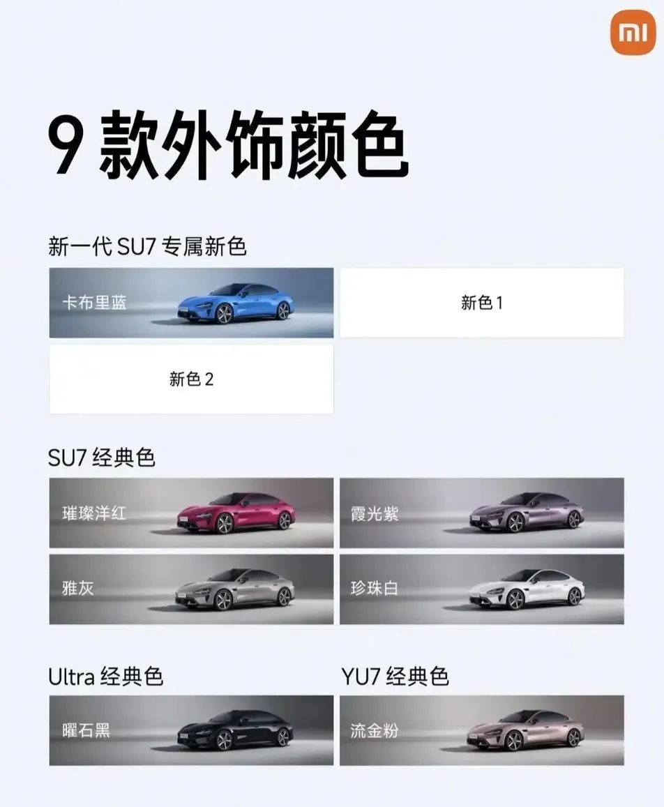 小米董事长兼CEO雷军在直播中透露,新一代小米SU7将提供9款配色,它保留了前代产品10款配色中的四款,加入SU7 Ultra及YU7经典配色,并提供包括卡布里蓝在内的三款新配色。据了解,预计2026年4月上市的改款小米SU7预售价22.99万元起,小订意向金1000元,上市后可退。配置方面,改款SU7全系标配碳化硅高压平台,全系长续航CLTC续航:标准版720km,Pro版902km,Max版835km;全系标配激光雷达,满配辅助驾驶。