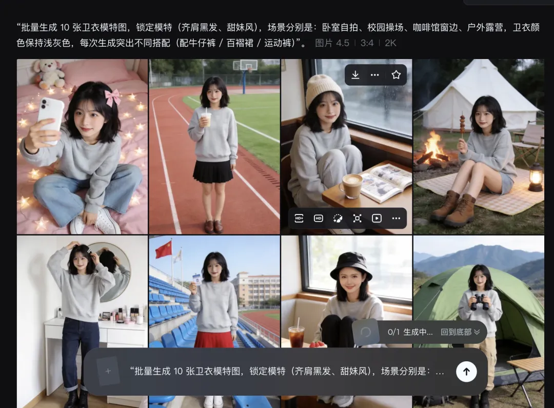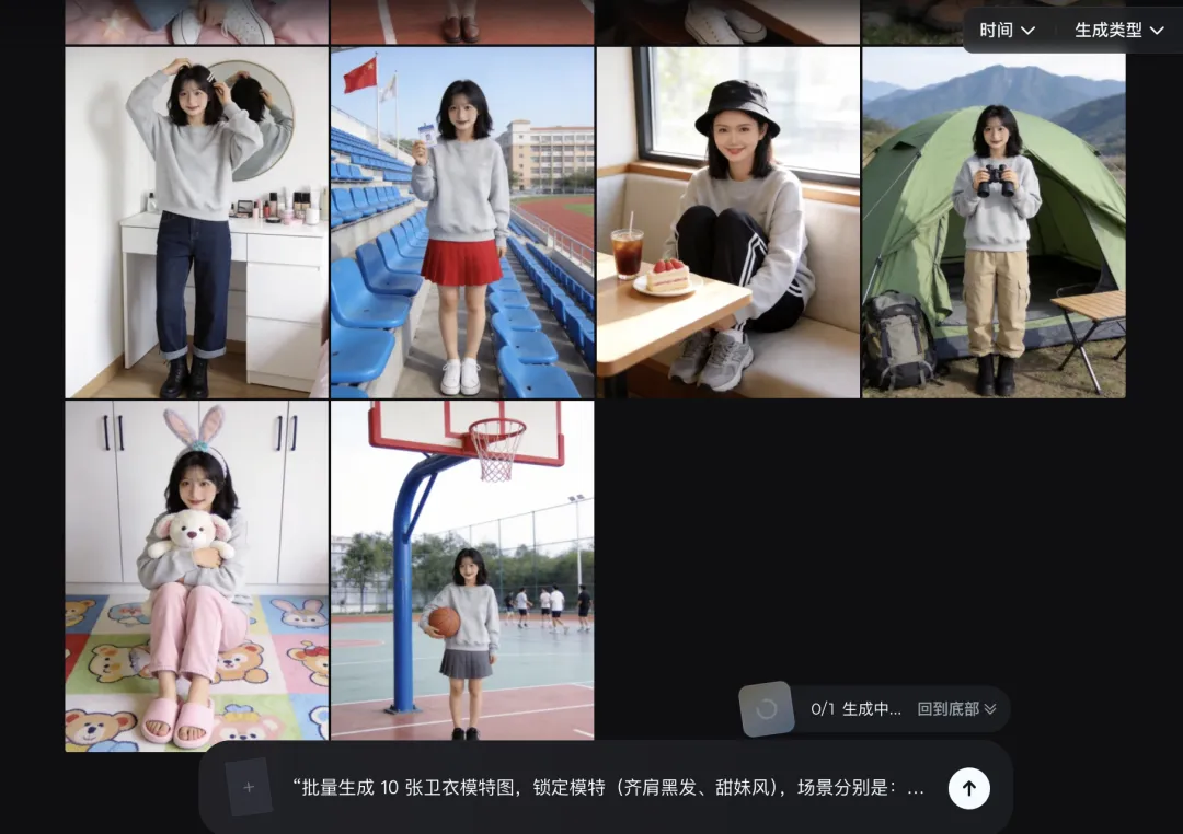 支持生成 100 张不同场景、风格的模特图,还能锁定模特形象和服装细节,不用一张张调整。大促前要做 10 套场景图?3 分钟搞定,比佐糖、美图快 10 倍,再也不用熬夜等图。