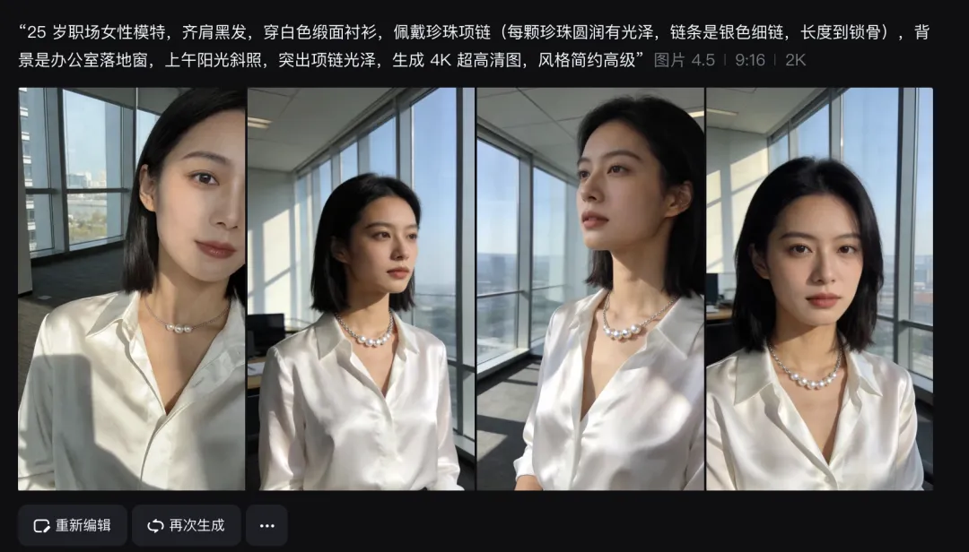 以 “珍珠项链职场场景图” 为例,教你用即梦 AI 生图 4.5 全程中文操作,10 分钟搞定,连我妈都能学会: