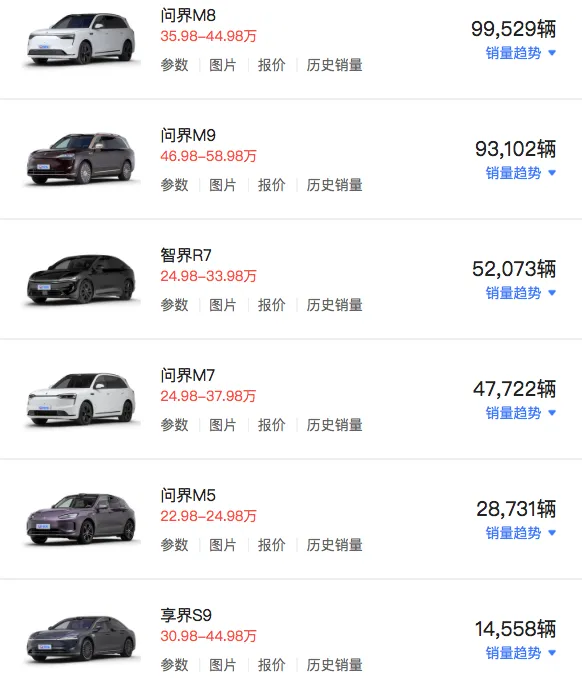 零售数据显示,今年前9月,鸿蒙智行旗下销量前三的车型分别为问界M8、问界M9、智界R7,年内累计销量分别为9.95万辆、9.31万辆、5.21万辆。此外,问界M7、问界M5、享界S9销量也达到万辆级别,分别为4.77万辆、2.87万辆、1.46万辆;智界S7、尊界S800、尚界H5、享界S9T销量分别为7101辆、2902辆、1901辆、1239辆。此外鸿蒙智行曾表示,2025年鸿蒙智行将挑战100万辆销量的新高度,随着年内更多新车型的布局,鸿蒙智行或能收获更大的市场影响力。