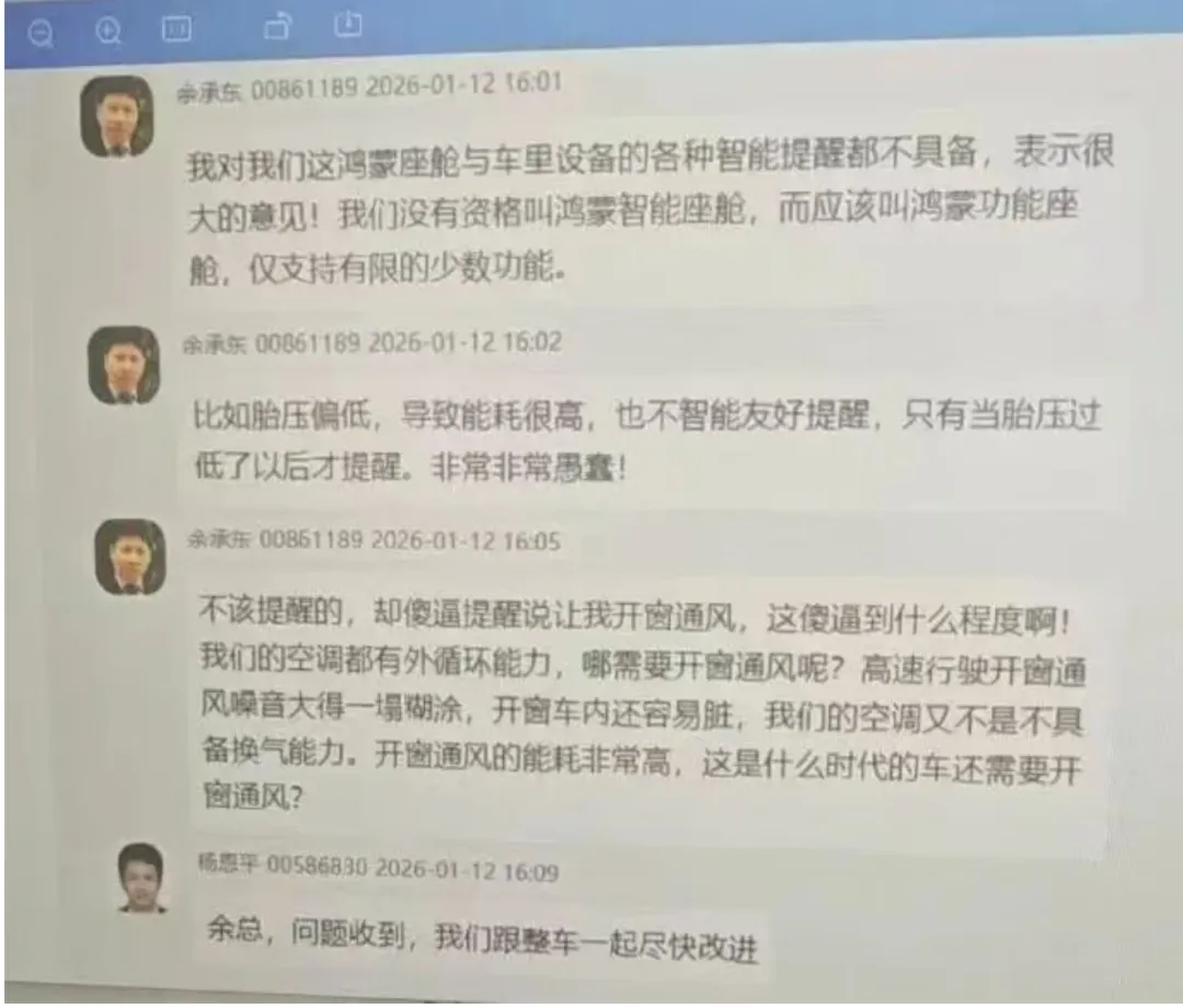 据流传的截图显示,余承东在群聊中直言,当前的系统“没有资格叫鸿蒙智能座舱”,而应改称为“鸿蒙功能座舱”,批评其仅支持有限功能,智能体验名不副实。他具体指出了两方面问题: