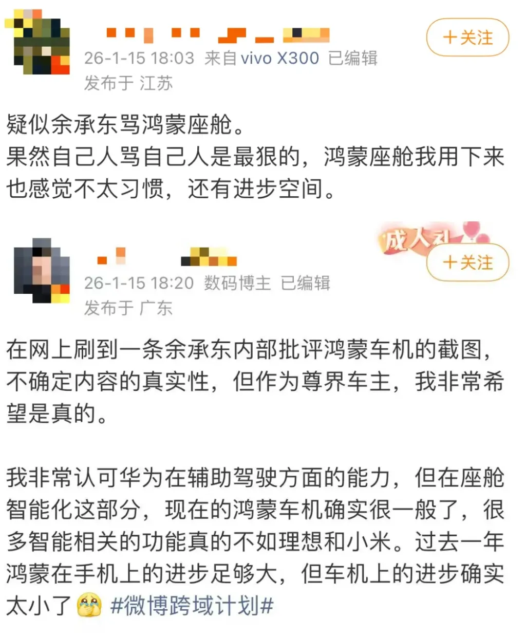 该截图流出后,在网友中引发两极讨论。一部分用户表示认同,认为华为鸿蒙座舱在智能化交互上确有改进空间,甚至落后于部分新势力品牌,这种内部的严厉批评有助于产品快速迭代。另一部分网友则将其与余承东在公开场合直言不讳的风格相联系。