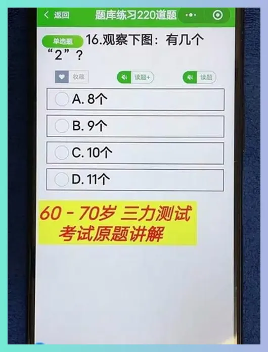 三力测试考的是记忆力、判断力、反应力,一共220道题随机抽20道。很多老人第一次考试直接懵了——题目跳得快,图片看不清,还有倒计时压力。