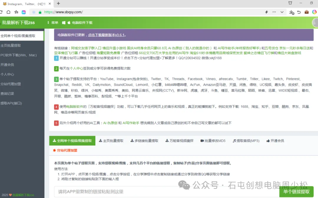 抖音、快手、火山、皮皮虾、微视、西瓜、头条、小红书、支持80多个平台无水印批量下载工具,视频去水印在线解析工具-抖音快手视频去水印解析网址:http://www.sbqsy.com(SB去水印很好记)备用网址2:http://zss.hhmvid.com3:公众号:sb去水印(复制网址到浏览器打开,即可无水印批量解析下载视频)点击可以查看高清图。