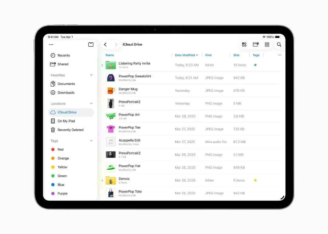 iOS 26 | iPadOS 26 —— 推出管理、访问、编辑文件的强大新方式。全面升级的文件 app 更新列表视图,供用户在可调整大小的分栏和可折叠的文件夹中查看更多文档信息。为了让文件夹更加一目了然,文件 app 还提供了文件夹自定义选项,包括自定义颜色、图标和表情符号等,并在不同设备间同步。