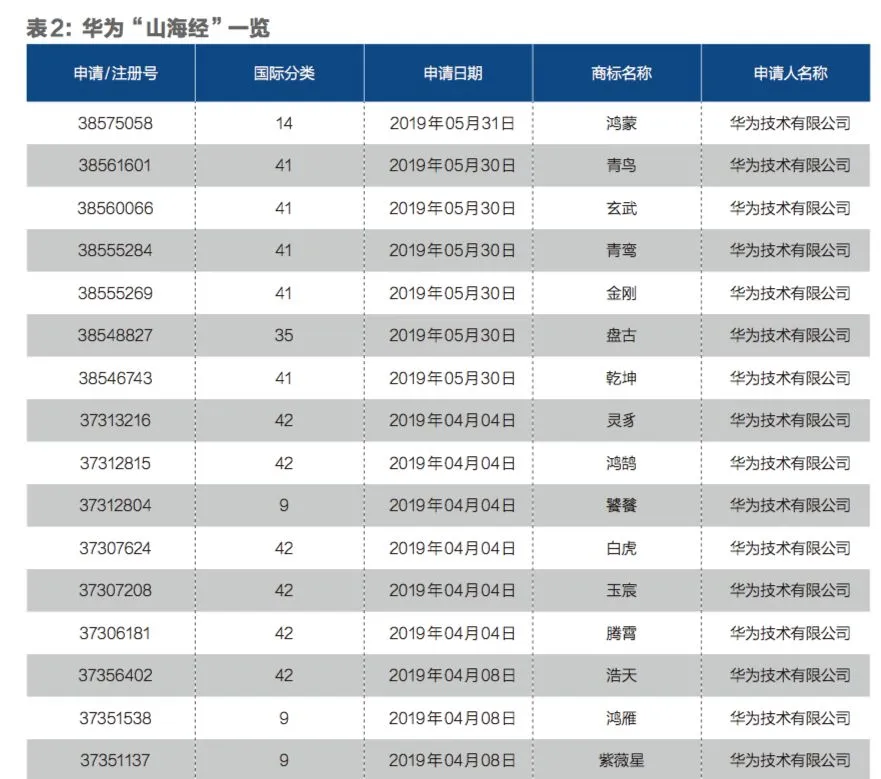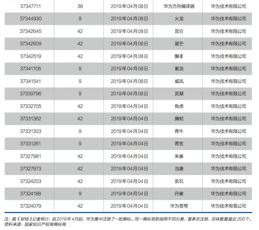 有迹象表明,山海经军团的规模还在不断扩大——《财经》记者查阅国家知识产权局商标局官方网站发现,从今年4月开始,华为集中注册了一批商标。同一商标名称按照不同分类,多次注册,总体数量接近200个。这些商标的名字囊括了“朱雀”、“腾蛇”、“青牛”、“青玄”、“当康”、“玄机”、“角虎”等。