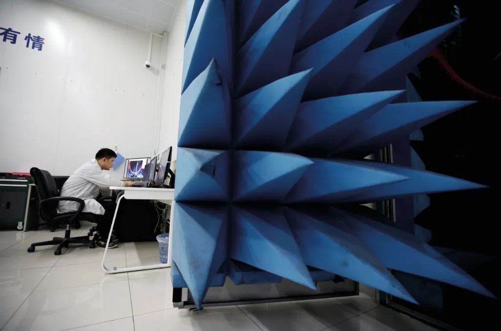 2019年5月30日,广东东莞,一名工程师在松山湖制造中心的华为SG178多探头球面近场测试系统工作。 图/视觉中国