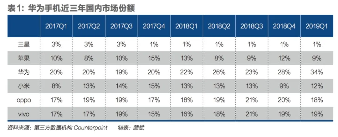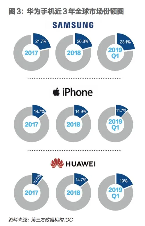 其三,美国步步紧逼持续高压华为之时,国内声援华为的力度却处于高峰,普通消费者对于华为的认可度飞速提升。第三方市场调研机构IDC的统计数据显示,2019年一季度中国智能手机出货量为8800万部,同比下降3%。但华为手机出货量为2990万部,同比增长41%,占33.98%的市场份额,排名第一。