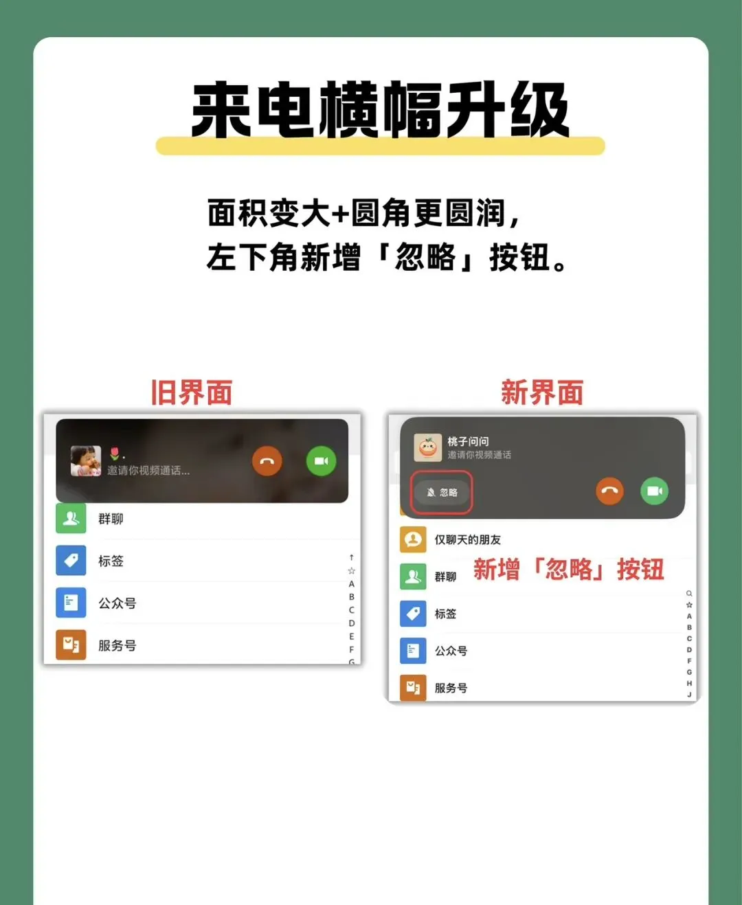 这次更新微信直接解决痛点,面积变大+圆角更圆润,左下角新增「忽略」按钮,不用纠结挂不挂,点一下就静音不打扰。