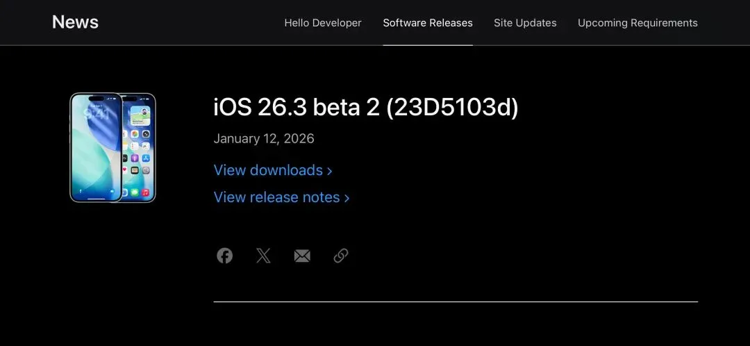 苹果 1 月 13 日推送 iOS 26.3 Beta2 版更新,同步推出的还有 iPadOS 正式版、macOS 测试版本等。