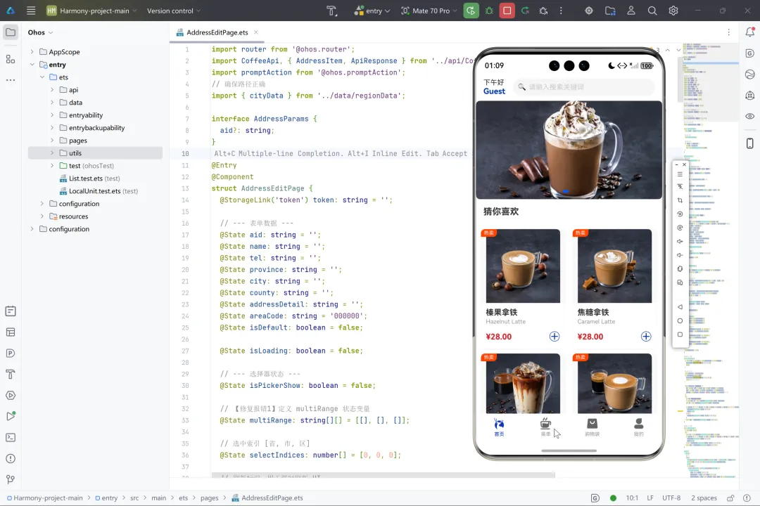 页面采用ArkTS声明式开发范式,结合HarmonyOS的UI组件体系构建。核心技术包括状态管理机制,通过@State装饰器管理轮播图数据和热卖商品数据的响应式更新,@StorageLink实现用户信息的跨页面状态同步。数据获取方面采用异步编程模式,通过async/await处理API请求,实现非阻塞数据加载。图片展示使用Image组件并配合ImageFit.Cover模式确保图片适配,同时设置备用图片提升容错性。