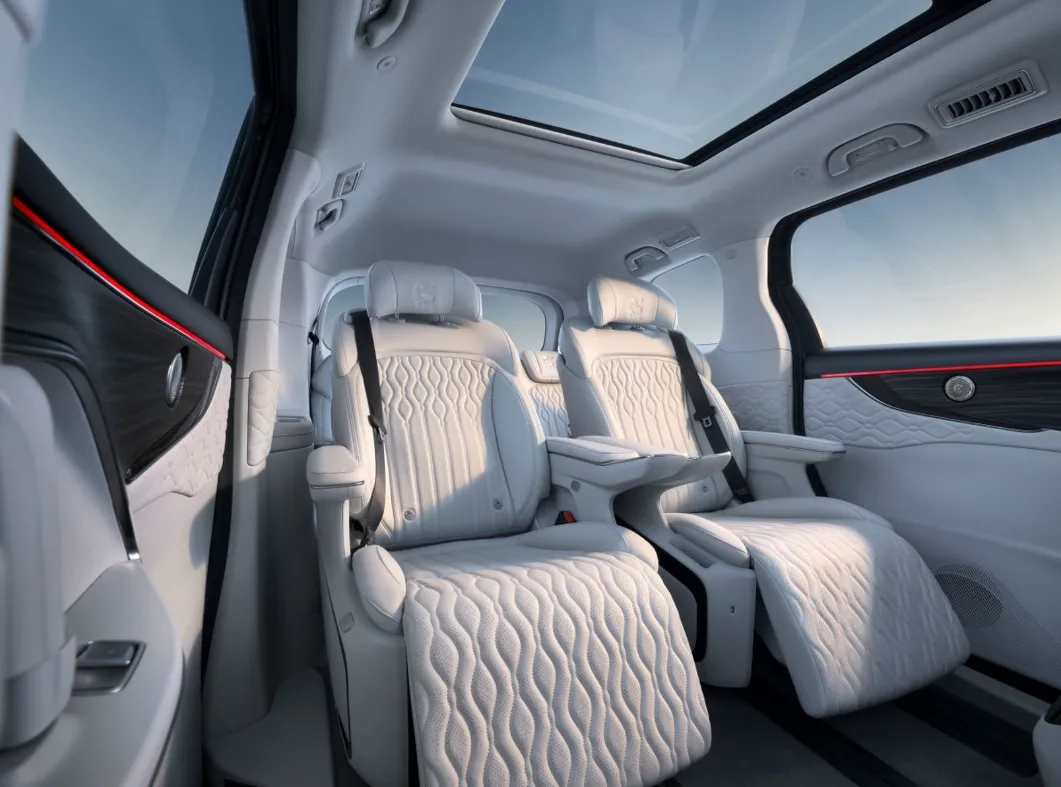 车侧的设计我挺喜欢的——双电动滑门,干净利落,不臃肿,档次直接拉满。相比理想MEGA那种“大胖脸”视觉,这台V9柔和得多。车尾一条贯穿式灯带,银色镀铬饰条绕了一圈,说句实话,如果遮住车标,真有点奔驰EQV那味儿。总体感觉,这车的外观定位很清晰,不激进、不油腻,但排面儿绝对顶满。