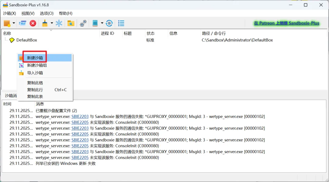 安装完成后软件会自动创建一个默认沙盒,当然你也可以自己新建,只要右键点击选择"新建沙盒"就能轻松搞定,操作起来特别简单。