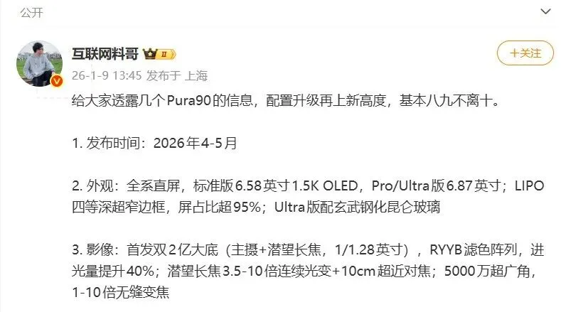 不过这一次Pura 90系列据说更换成了2.5D微曲直屏。屏幕的占比直接达到95%以上。
