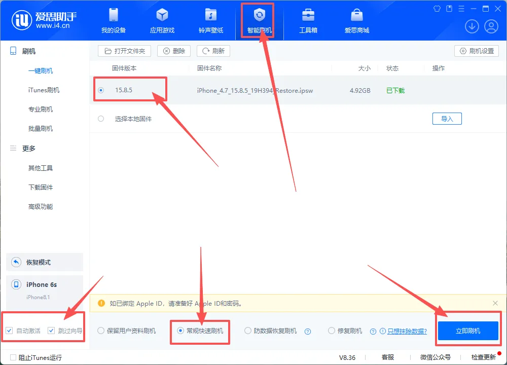 2、点开只能刷机,下载刷机固件后,点“立即刷机”,如图