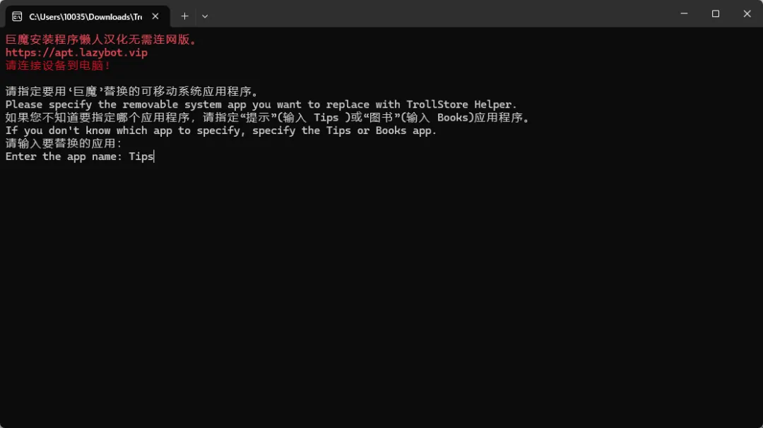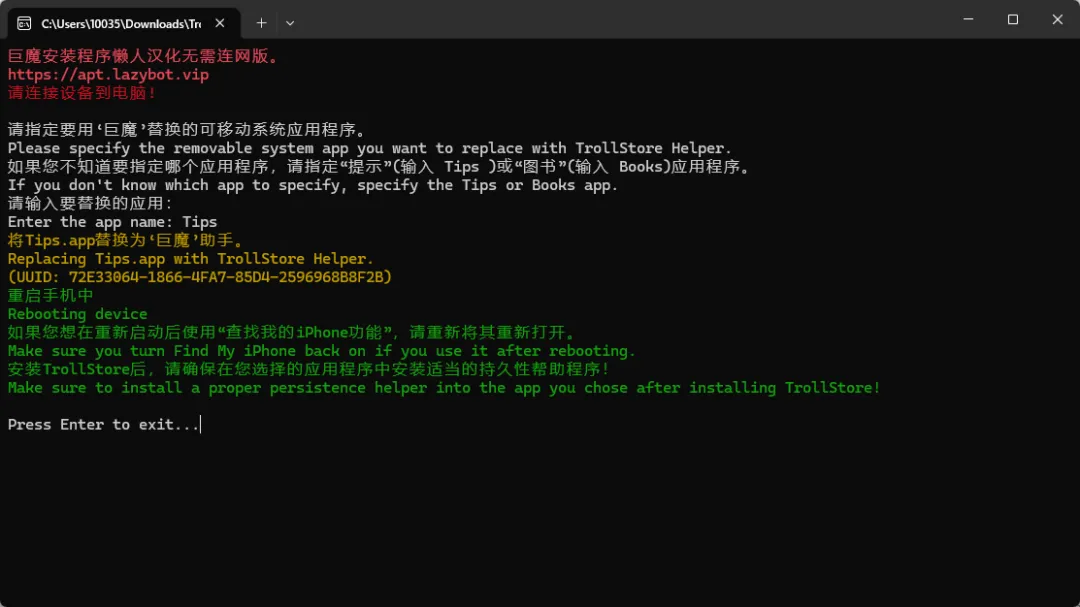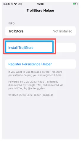 8、安装完成后,手机上会多一个APP,叫TrollRestore(巨魔),后期统称巨魔,打开他,会自动安装did,(如果提示失败,说明VPN没连上)