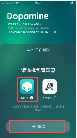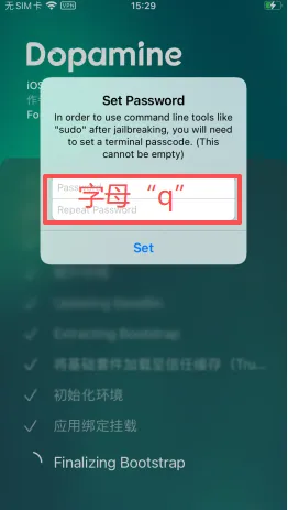 12、点越狱,等待自动越狱,弹出矿提示安装sileo商店,账号密码都输入字母“q”