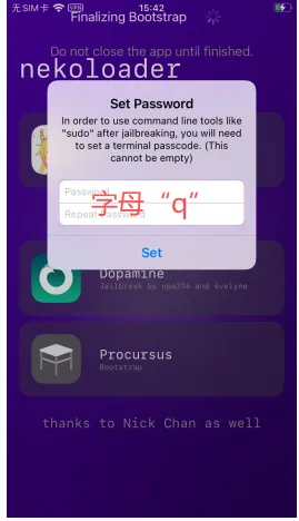 13、等待越狱完成,自动回到桌面,开启VPN,打开另一个兔耳朵小姐姐nekoloader,自动引导,期间提示你输入账号和密码,都输入字母“q”