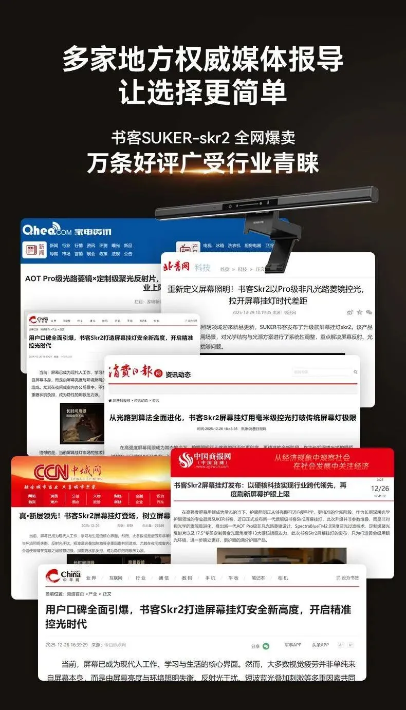 传统的非对称光源虽然在一定程度上能缓解屏幕反射问题,但实际使用中容易在屏幕边缘形成明暗不均的现象,长时间下来会影响用眼舒适度。作为行业内持续深耕光学结构的代表品牌之一,书客并未停留在常规方案上,而是自研推出了新一代AOT Pro级非凡光路菱镜技术+EyePath专研定向控光黄金角,并在灯体两侧搭配两片定制级聚光反射片,通过8段不同曲率的精密组合,能够对光线进行二次聚焦与定向校准,实现了对光线路径的毫米级精准锁定,让每一条光线路径都处在可控范围内,从源头中和LED背光带来的杂散问题,有效减少86%的屏幕反光干扰。此外书客skr2采用了第二代SunLite类太阳光灯珠,并融合了针对短波蓝光的SpectraBlue2.0过滤与抑制机制,在不牺牲亮度和色彩层次的前提下,将蓝光潜在危害进一步压低,整体蓝光影响降低约64%。在真实使用场景中,提供更接近自然光、更友好的屏幕用眼环境,并以此打造出领先行业的全屏精准遮光解决方案。