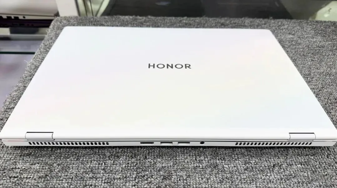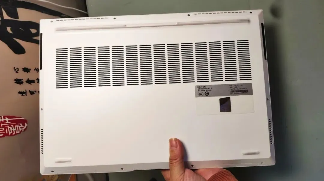翻转Pro16到机身底壳,它的设计充满了荣耀自家特点。底壳一体成型,极简风格布局,白色面板上开孔,较为醒目。靠近转轴的地方是左右对称的出风口,往下是上下对称的橡胶防滑脚垫,色彩偏灰。再往下居中区域是大面积的进气孔,条形栅格纹理,排列整齐,看得到里面的电子元器件。来到底壳边缘,做了20mm左右的凹凸设计,在掌托区域分别增加两个开孔,是机器的扬声器,扬声器功率很大,播放音频时,声音高亢,平置机器声音轻松反弹回来。