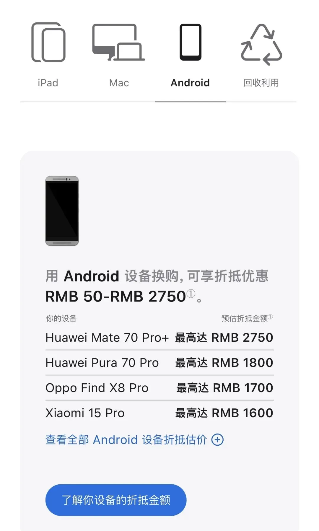 用户现在可以通过苹果官网或Apple Store零售店,用符合条件的安卓手机折抵购买新的苹果设备。